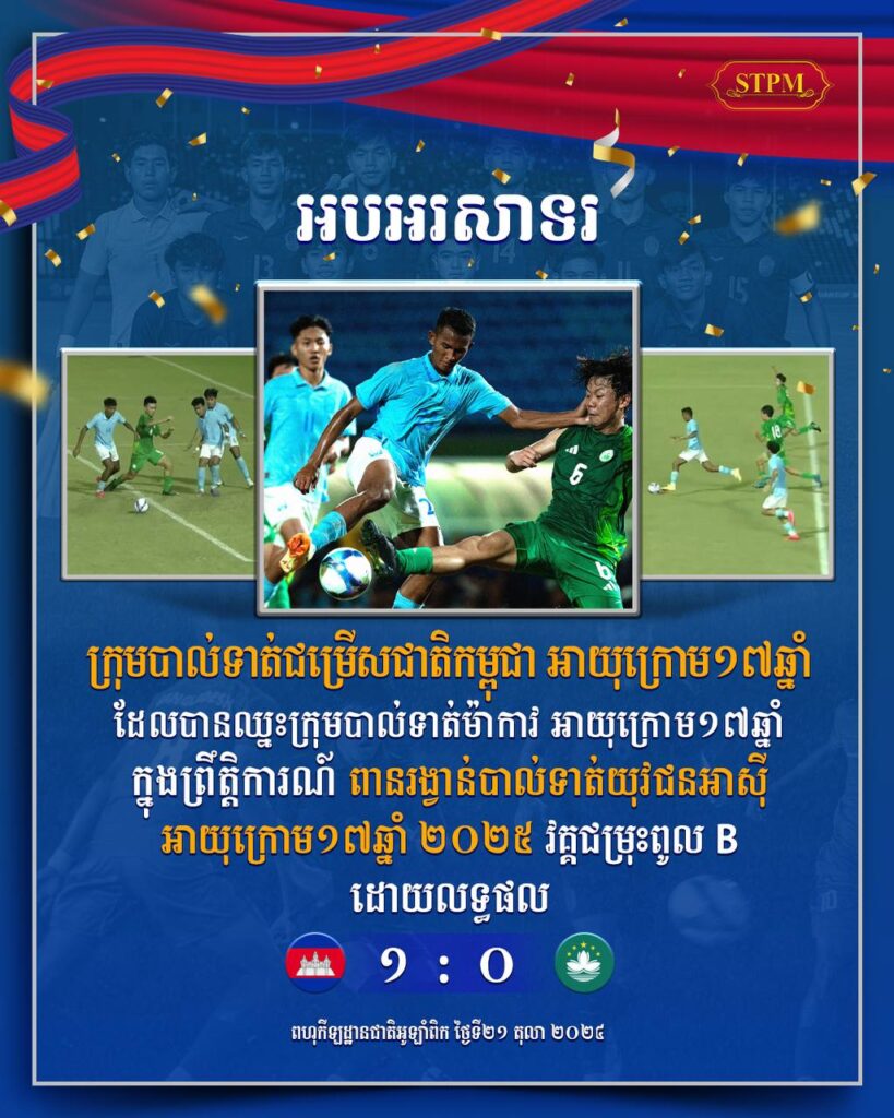 អបអរសាទរ ក្រុមបាល់ទាត់ជម្រើសជាតិកម្ពុជា អាយុក្រោម១៧ឆ្នាំ ដែលបានឈ្នះក្រុមបាល់ទាត់ម៉ាកាវ អាយុក្រោម១៧ឆ្នាំ ក្នុងព្រឹត្តិការណ៍ ពានរង្វាន់បាល់ទាត់យុវជនអាស៊ីអាយុក្រោម១៧ឆ្នាំ ២០២៥ វគ្គជម្រុះពូល B ដោយលទ្ធផល ១ ទល់ ០