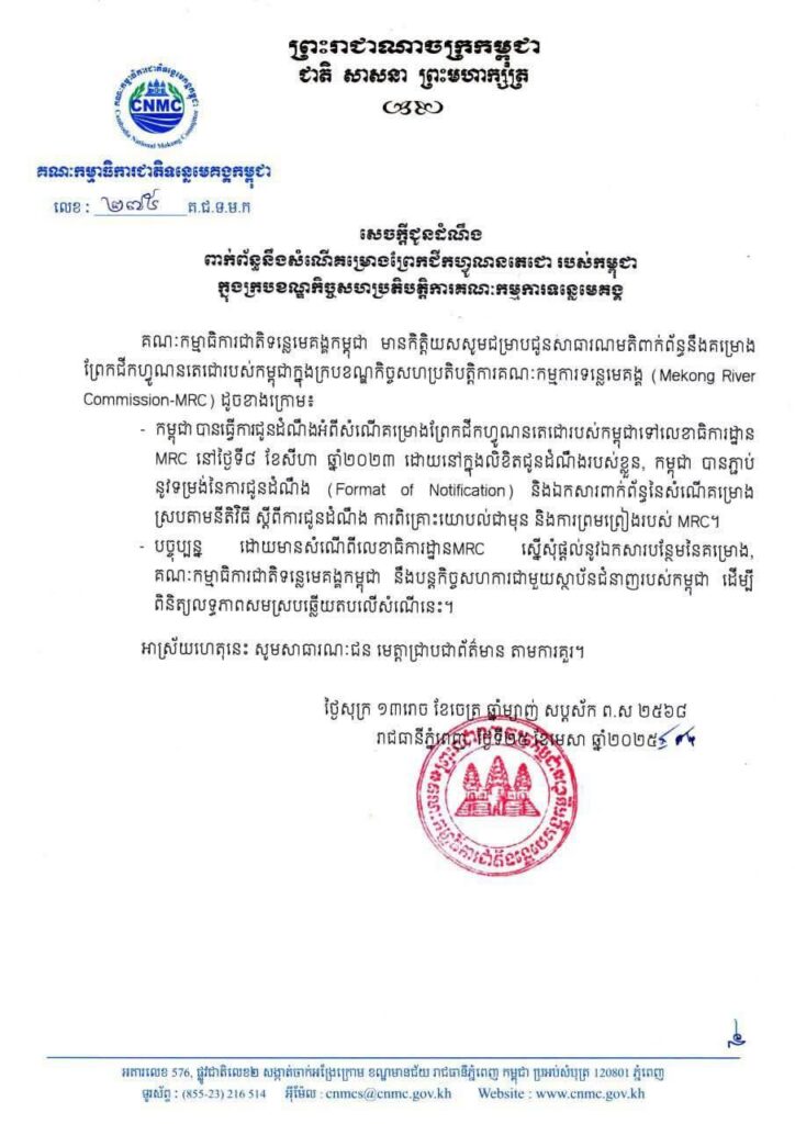គណ:កម្មាធិការជាតិទន្លេមេគង្គកម្ពុជា មានកិត្តិយសសូមជម្រាបជូនសាធារណជន មេត្តាជ្រាបសេចក្តីជូនដំណឹងពាក់ព័ន្ធនឹងគម្រោងព្រែកជីកហ្វូណនតេជោរបស់កម្ពុជា ក្នុងក្របខណ្ឌកិច្ចសហប្រតិបត្តិការគណ:កម្មការទន្លេមេគង្គ (MRC)។