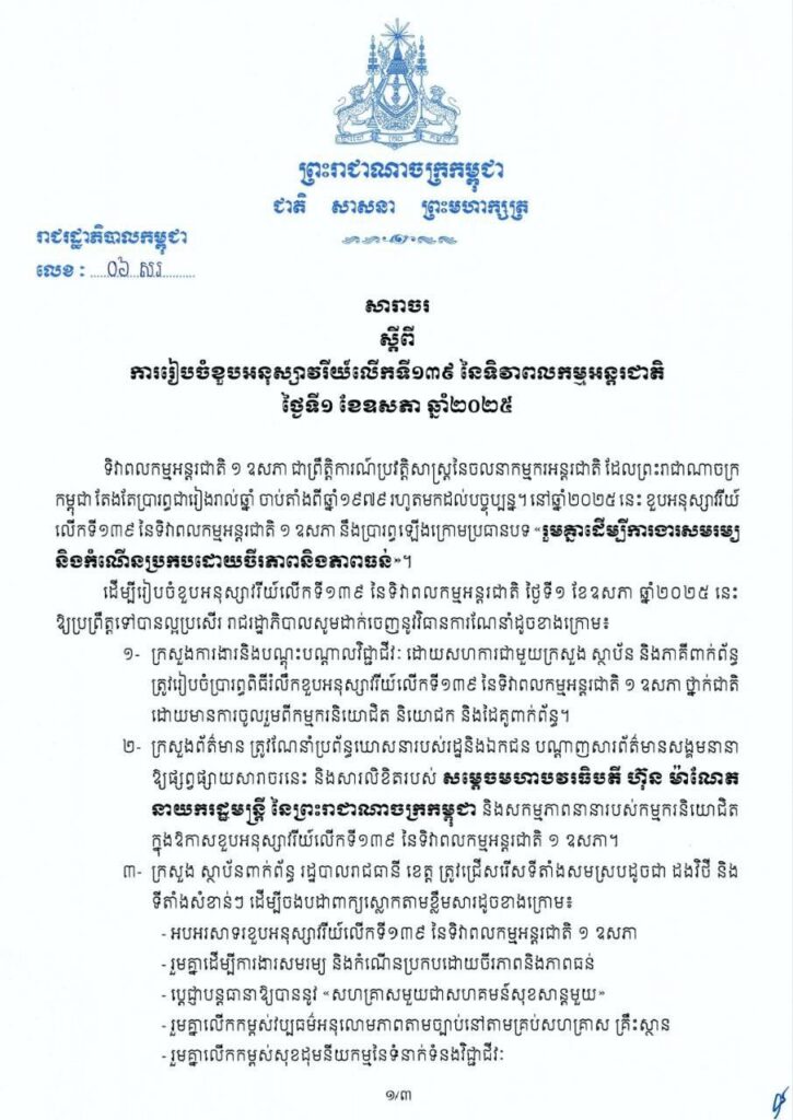 សារាចរ ស្តីពី ការរៀបចំខួបអនុស្សាវរីយ៍លើកទី១៣៩ នៃទិវាពលកម្មអន្តរជាតិ ថ្ងៃទី១ ខែឧសភា ឆ្នាំ២០២៥
