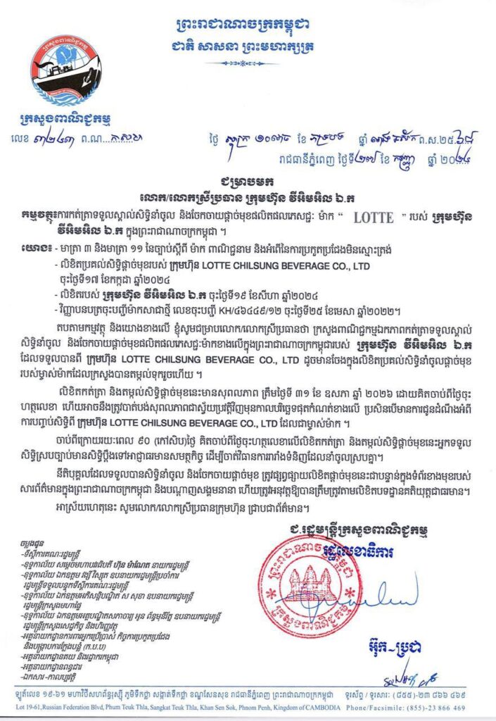 ក្រសួងពាណិជ្ជកម្មទទួលស្គាល់សិទ្ធិនាំចូលនិងចែកចាយផ្តាច់មុខផលិតផលភេសជ្ជៈម៉ាក “LOTTE”ដោយក្រុមហ៊ុន VML