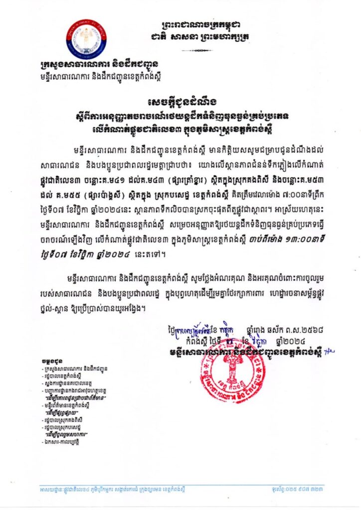 សេចក្តីជូនដំណឹង ស្តីពីការអនុញ្ញាតចរាចរណ៍រថយន្តដឹកទំនិញធុនធ្ងន់គ្រប់ប្រភេទលើកំណាត់ផ្លូវជាតិលេខ៣ ក្នុងភូមិសាស្រ្តខេត្តកំពង់ស្ពឺ