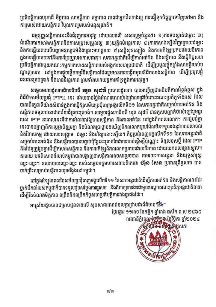 សេចក្តីប្រកាសព័ត៌មាន ស្តីពីលទ្ធផលសម័យប្រជុំពេញអង្គលើកទី១១ នៃសភាអន្តរជាតិ ដើម្បីភាពអត់ឱន និងសន្តិភាព (IPTP-11)