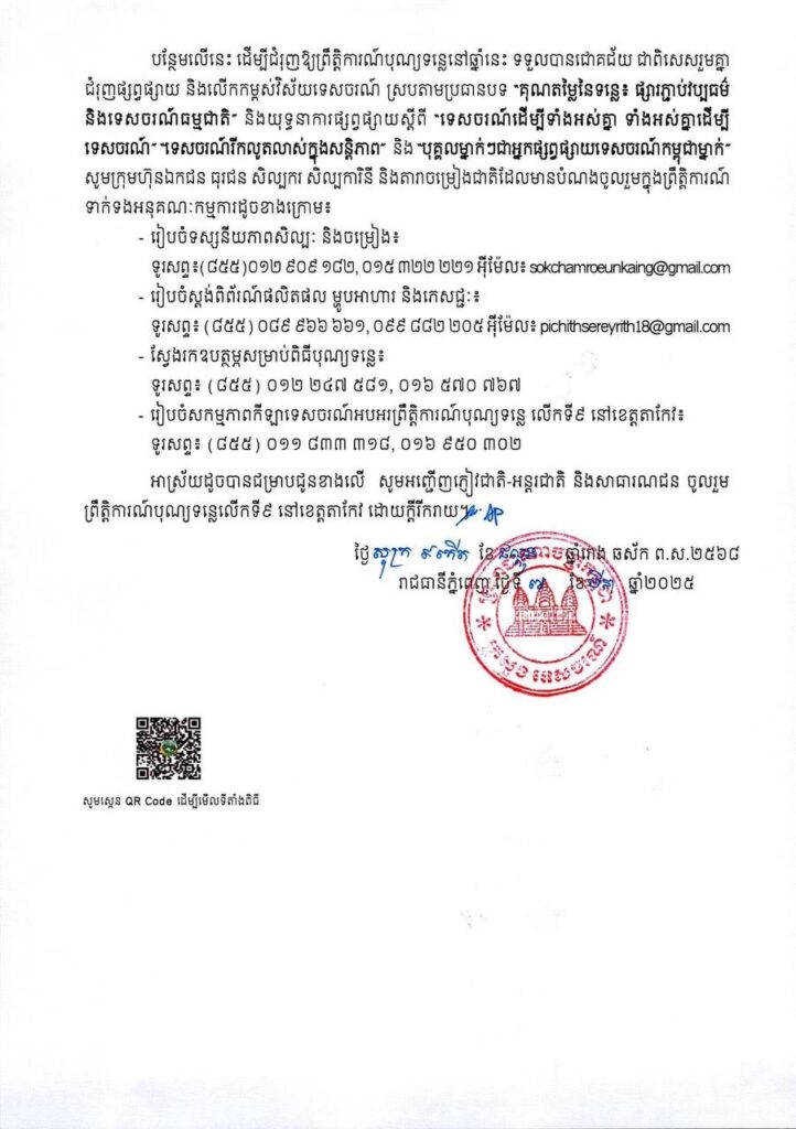 សេចក្តីជូនដំណឹង ស្តីពីព្រឹត្តិការណ៍បុណ្យទន្លេលើកទី៩ ឆ្នាំ២០២៥ នៅខេត្តតាកែវ ក្រោមប្រធានបទ«គុណតម្លៃនៃទន្លេ៖ ផ្សារភ្ជាប់វប្បធម៌ និងទេសចរណ៍ធម្មជាតិ»