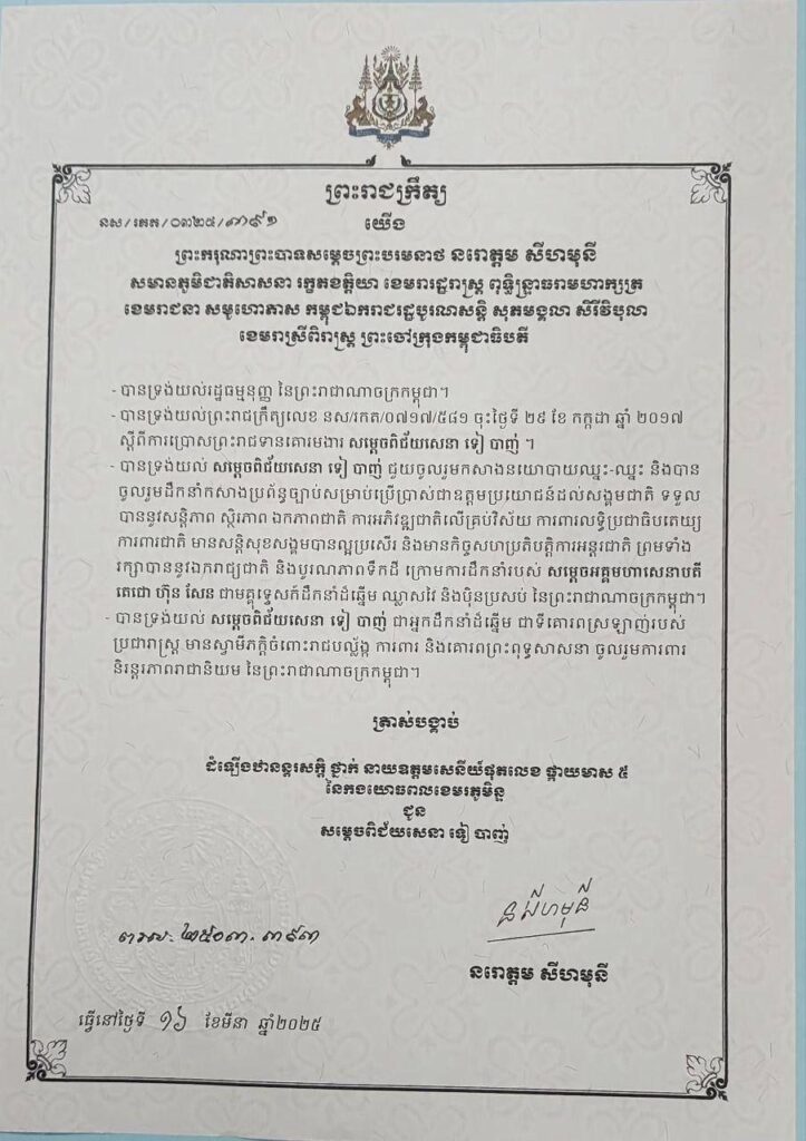ព្រះករុណា ព្រះបាទ សម្តេចព្រះបរមនាថ នរោត្តម សីហមុនី ព្រះមហាក្សត្រនៃព្រះរាជាណាចក្រកម្ពុជា ត្រាស់បង្គាប់ដំឡើងឋានន្តរសក្តិ ថ្នាក់ នាយឧត្តមសេនីយ៍ផុតលេខផ្កាយមាស ៥ នៃកងយោធពលខេមរភូមិន្ទ ជូន សម្តេចពិជ័យសេនា ទៀ បាញ់ និងសម្តេចកិត្តិសង្គបណ្ឌិត ម៉ែន សំអន