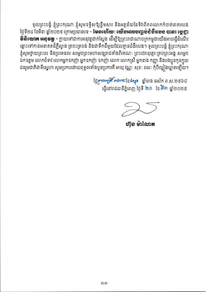 សារលិខិត សម្តេចមហាបវរធិបតី ហ៊ុន ម៉ាណែត នាយករដ្ឋមន្ត្រី នៃព្រះរាជាណាចក្រកម្ពុជា ក្នុងឱកាសប្រារព្ធទិវាពិភពលោកកំចាត់រោគរបេង ក្រោមប្រធានបទ៖ «មែនហើយ ! យើងអាចបញ្ចប់ជំងឺរបេងបាន៖ ប្តេជ្ញា វិនិយោគ អនុវត្ត»