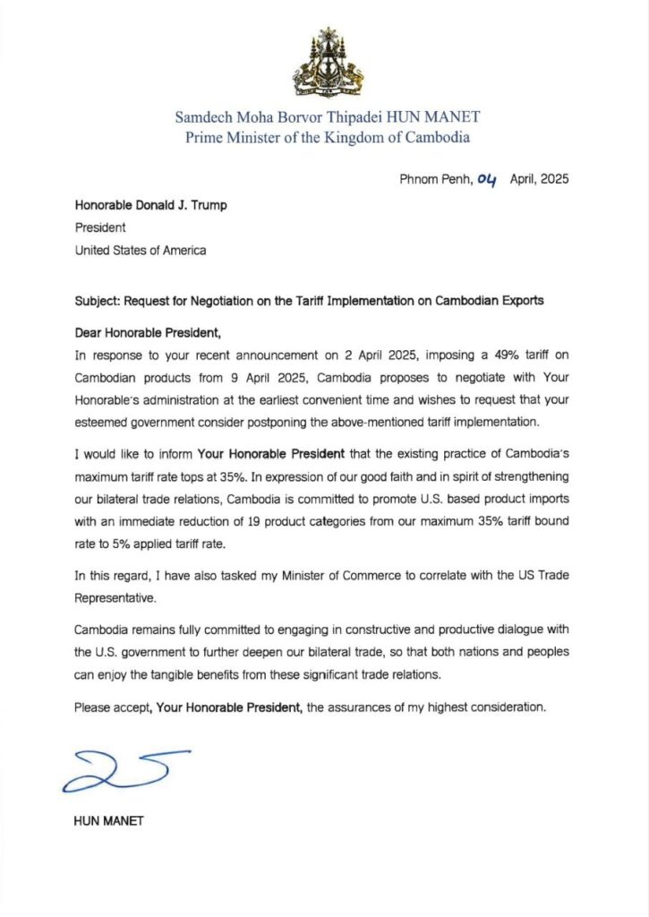ជាការឆ្លើយតបទៅនឹងការប្រកាសរបស់ឯកឧត្តម កាលពីថ្ងៃទី២ ខែមេសា ឆ្នាំ២០២៥ ក្នុងការដាក់អនុវត្តនូវអត្រាពន្ធនាំចូល ៤៩% លើទំនិញរបស់កម្ពុជា ចាប់ពីថ្ងៃទី៩ ខែមេសា ឆ្នាំ២០២៥ ខាងមុខនេះ, កម្ពុជាសូមស្នើបើកការចរចាជាមួយរដ្ឋាភិបាលរបស់ឯកឧត្តម ក្នុងពេលដ៏ឆាប់បំផុត តាមដែលអាចធ្វើទៅបាន និងសូមស្នើរដ្ឋាភិបាលរបស់ឯកឧត្តម ពន្យារការអនុវត្តអត្រាពន្ធនាំចូលថ្មីនេះ ដោយក្តីអនុគ្រោះ។