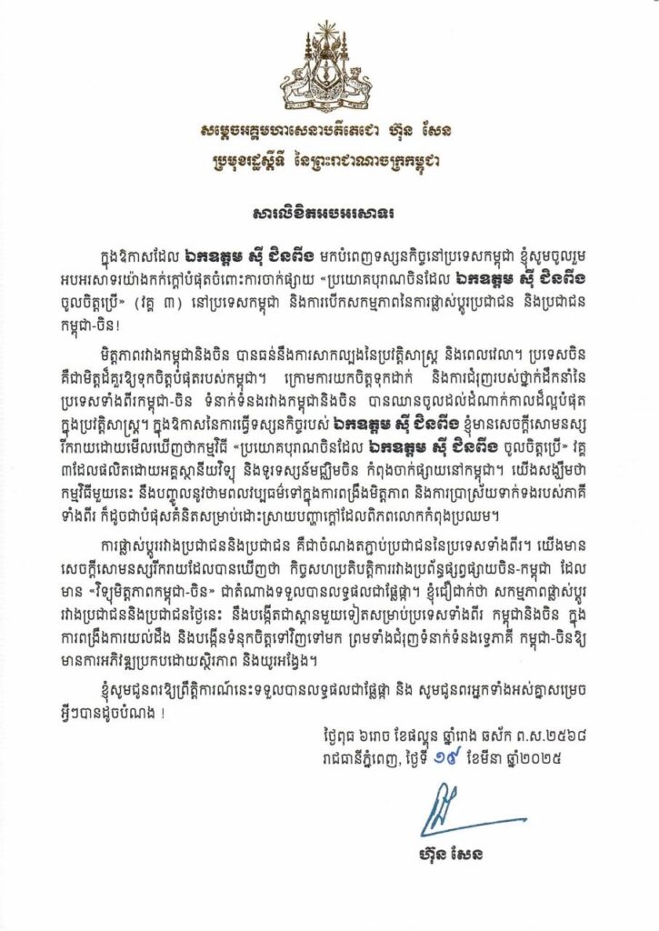 សម្តេចតេជោ ហ៊ុនសែន ផ្ញើសារលិខិត ដើម្បីសម្តែងការអបអរសាទរយ៉ាងកក់ក្តៅចំពោះការចាក់ផ្សាយកម្មវិធី《ប្រយោគបុរាណចិនដែលលោក Xi Jinping ចូលចិត្ត》ជាភាសារខ្មែរ