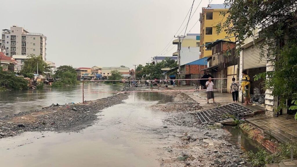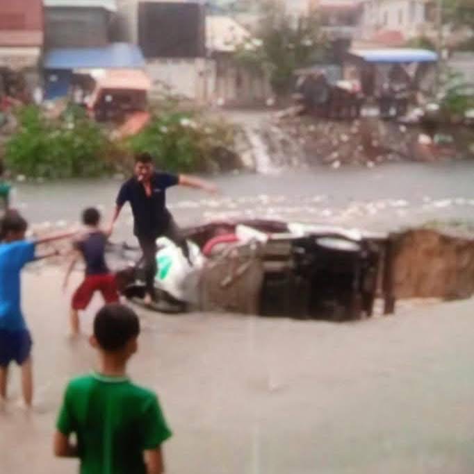 ក្រោយភ្លៀងមួយមេធំ ធ្វើឱ្យបាក់ស្រុតផ្លូវអមមាត់ប្រឡាយលូស្ទឹងមានជ័យធ្លាក់កង់បី១គ្រឿង តែសំណាងល្អប្រជាពលរដ្ឋក្បែរនោះជួយស្រោចស្រង់ កង់បីឡើងមកវិញបាន។