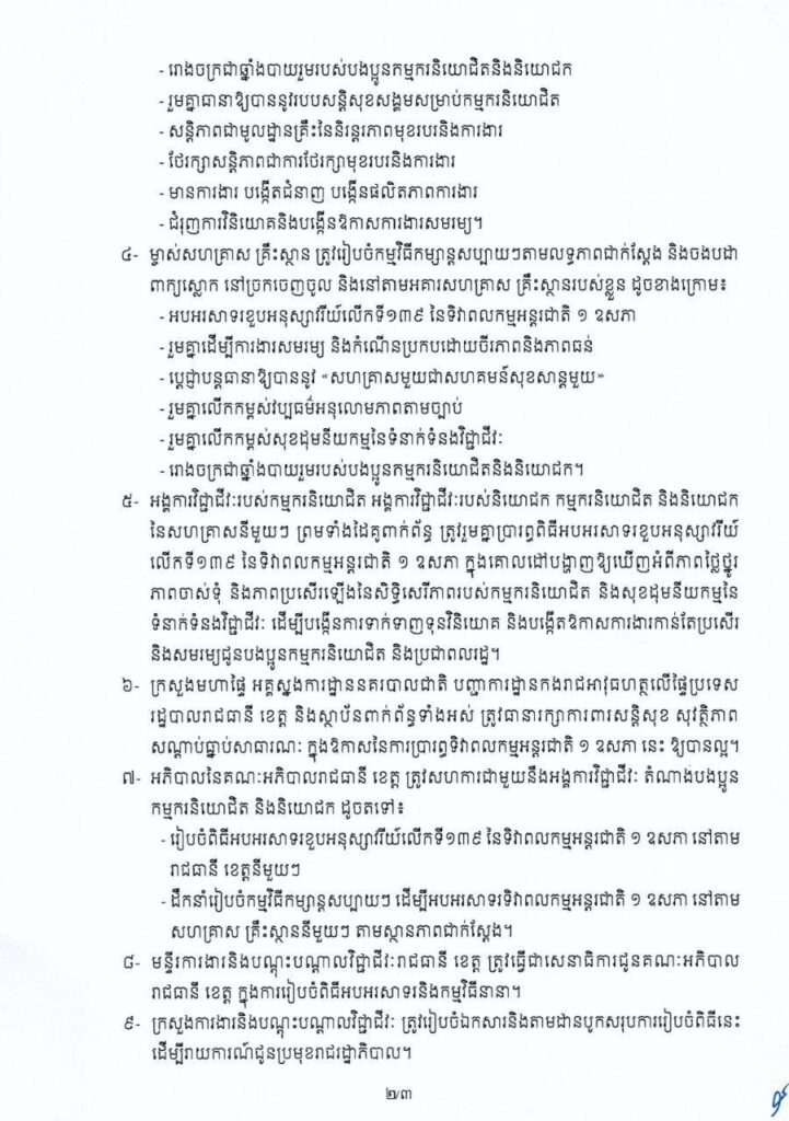 សារាចរ ស្តីពី ការរៀបចំខួបអនុស្សាវរីយ៍លើកទី១៣៩ នៃទិវាពលកម្មអន្តរជាតិ ថ្ងៃទី១ ខែឧសភា ឆ្នាំ២០២៥