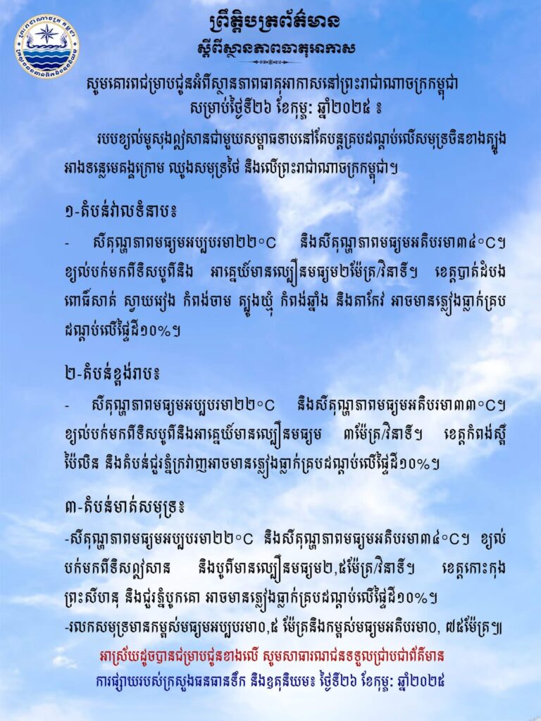 ស្ថានភាពធាតុអាកាសនៅព្រះរាជាណាចក្រកម្ពុជាសម្រាប់ថ្ងៃទី២៦ ខែកុម្ភៈ ឆ្នាំ២០២៥