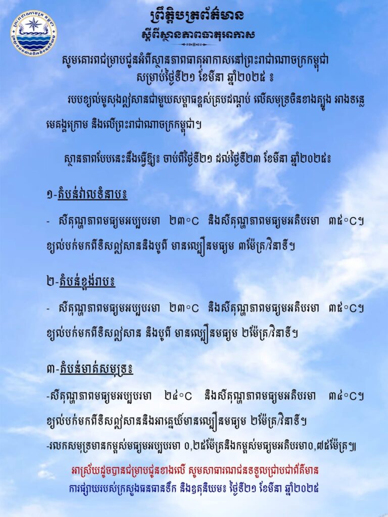 ស្ថានភាពធាតុអាកាសនៅព្រះរាជាណាចក្រកម្ពុជាសម្រាប់ថ្ងៃទី២១ ខែមីនា ឆ្នាំ២០២៥៖