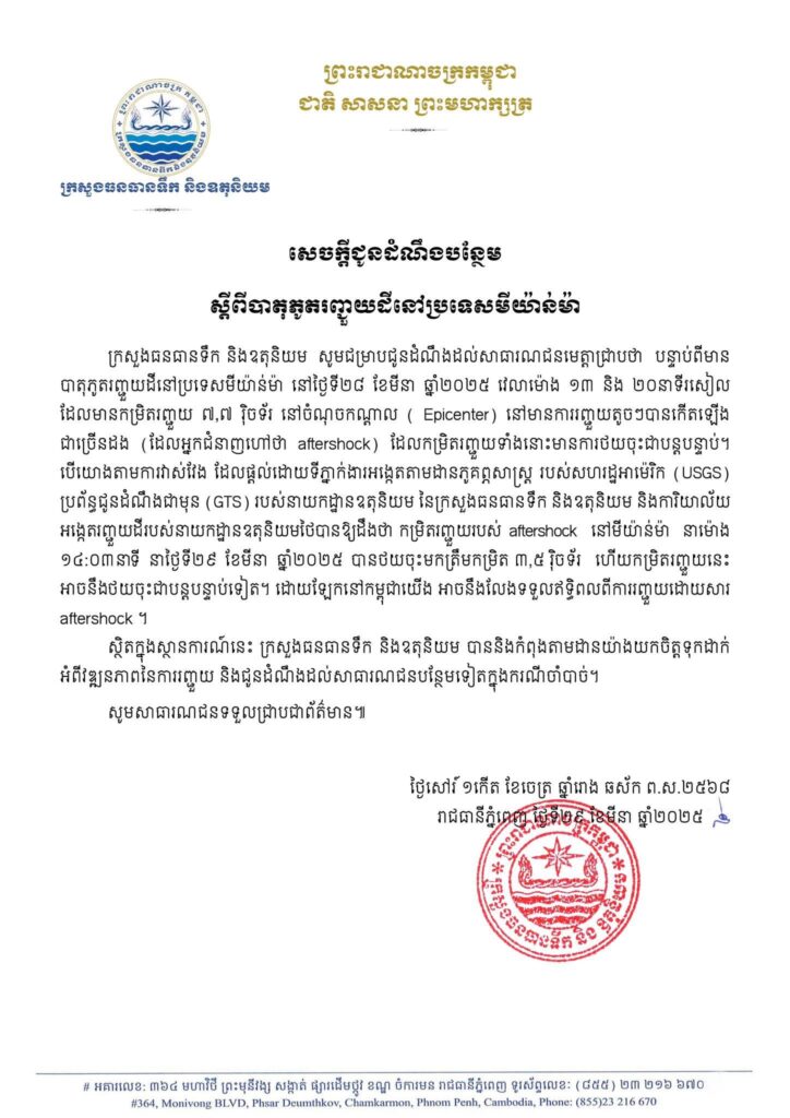 សេចក្តីជូនដំណឹងបន្ថែម ស្ដីពីបាតុភូតរញ្ជួយដីនៅប្រទេសមីយ៉ាន់ម៉ា