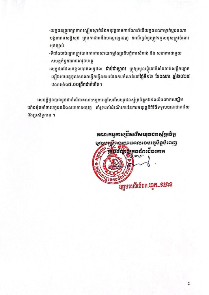( ភ្នំពេញ)៖ កងទ័ពជើងគោក នៃកងយោធពលខេមរភូមិន្ទ សូមជូនដំណឹងដល់យុវជនស្ម័គ្រចិត្តចូលបម្រើកងយោធពលខេមរភូមិន្ទបំពេញក្របខណ្ឌឱ្យកងទ័ពជើងគោកបានជ្រាបថា៖ គណៈកម្មការជ្រើសរើសយុវជនស្ម័គ្រចិត្តចូលបម្រើកងយោធពលខេមរភូមិន្ទបំពេញក្របខណ្ឌឱ្យ កងទ័ពជើងគោក សូមជម្រាបជូនដំណឹងដល់បេក្ខជនជាប់បឋម ដូចមានក្នុងបញ្ជីរាយនាមបានបិទ ប្រកាស តាមបណ្តាទីតាំងជ្រើសរើសជ្រាបថា៖ ដើម្បីអោយបាន តម្លាភាព សុក្រឹត្យភាព និងយុត្តិធម៌ គណៈកម្មការជ្រើសរើសយុវជនស្ម័គ្រចិត្តចូលបម្រើកងយោធពលខេមរភូមិន្ទបំពេញក្របខណ្ឌឱ្យកងទ័ព ជើងគោកបានសម្រេចបន្តនីតិវិធីចុងក្រោយគឺ នីតិវិធី ចាប់សន្លឹកឆ្នោត។