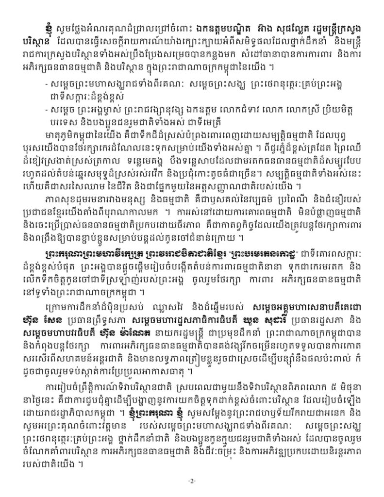 ព្រះរាជសុន្ទរកថាទាំងស្រុងរបស់ព្រះមហាក្សត្រ ក្នុងព្រះរាជពិធីទិវាបរិស្ថានជាតិ និងបរិស្ថានពិភពលោក ក្រោមប្រធានបទ៖ ប្រយុទ្ធប្រឆាំងការបំពុលដោយប្លាស្ទិក