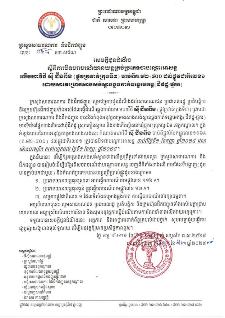 ក្រសួងសាធារណការ និងដឹកជញ្ជូន សូមជម្រាបជូនដំណឹងដល់សាធារណជន ប្រជាពលរដ្ឋ ប្រតិបត្តិករ និងក្រុមហ៊ុនដឹកជញ្ជូនទាំងអស់ដែលធ្វើដំណើរឆ្លងកាត់តាម មហាវិថី ស៊ី ជីនពីង (ផ្លូវក្រវាត់ក្រុងទី៣) ជ្រាបថា ក្រសួងសាធារណការ និងដឹកជញ្ជូន បាននិងកំពុងអនុវត្តគម្រោងសាងសង់ស្ពានឆ្លងកាត់ទន្លេមេគង្គ (ដីឥដ្ឋ-ថ្មគរ) មានទីតាំងផ្នែកខាងលិច នៅឃុំដីឥដ្ឋ ស្រុកកៀនស្វាយ និងខាងកើតស្ថិតនៅឃុំថ្មគរ ស្រុកល្វាឯម ខេត្តកណ្តាល។ ក្នុងអំឡុងពេលនៃការសាងសង់នេះ កំណាត់ផ្លូវមហាវិថី ស៊ី ជីនពីង ចាប់ពីផ្លូវបំបែកផ្លូវលេខ១១៦ A (គ.ម២+៨០០) ដល់ផ្លូវជាតិលេខ១ ត្រូវបានបិទជាបណ្តោះអាសន្ន ចាប់ពីថ្ងៃទី១ ខែកញ្ញា ឆ្នាំ២០២៥ វេលាម៉ោង០៧ព្រឹក តទៅរហូតដល់ ថ្ងៃទី១ ខែកុម្ភៈ ឆ្នាំ២០២៨។