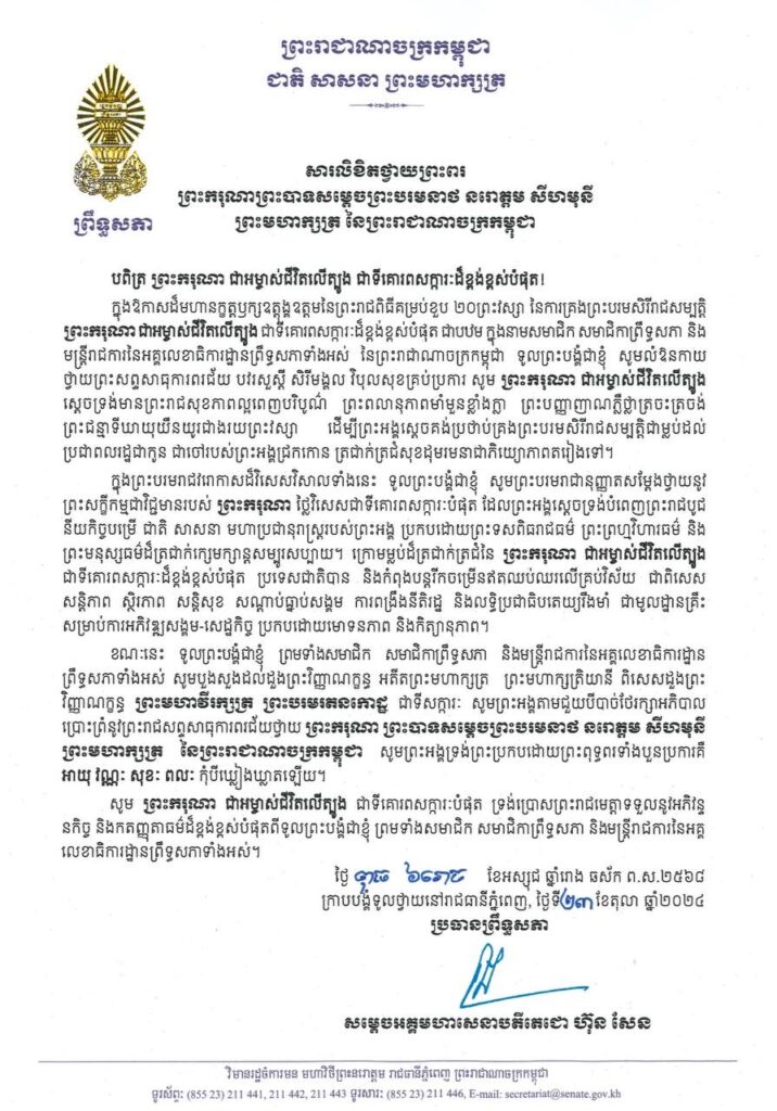 សម្តេចអគ្គមហាសេនាបតីតេជោ ហ៊ុន សែន ប្រធានព្រឹទ្ធសភានៃព្រះរាជាណាចក្រកម្ពុជា ប្រធានក្រុមឧត្តមប្រឹក្សាផ្ទាល់ព្រះមហាក្សត្រ និងជាប្រធានគណបក្សប្រជាជនកម្ពុជា គោរពថ្វាយព្រះពរ ព្រះករុណា ព្រះបាទ សម្តេចព្រះបរមនាថ នរោត្តម សីហមុនី ព្រះមហាក្សត្រនៃព្រះរាជាណាចក្រកម្ពុជា ក្នុងឱកាសដ៏មហានក្ខត្តឫក្សខួបលើកទី ២០ នៃការគ្រងរាជសម្បត្តិជាព្រះមហាក្សត្រនៃព្រះរាជាណាចក្រកម្ពុជា៕